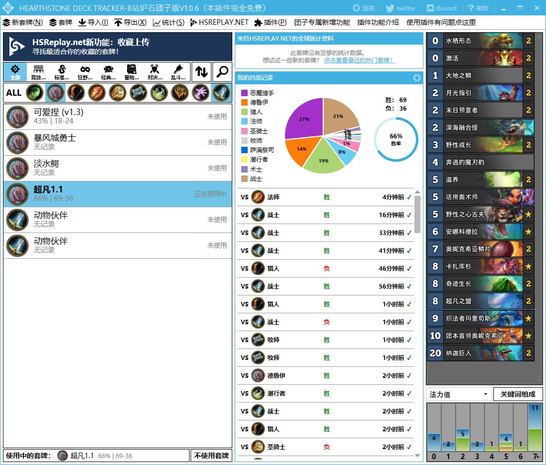 大家好我是花花,新版本之后整体环境都发生了变化,伊利丹取代了玛法里奥成为了新的版本答案,天梯大部分职业都是以瞎子和对阵瞎子优势的卡组为主的(用记牌器统计的105把中,瞎子共27%,28个,对瞎子优势的战骑共26%,27个)以及一些任务猎和小部分法师,这样的环境想要高效上分又不想玩瞎子的话,那么不如另辟蹊径加入新版本的超凡德。对阵除瞎子以外其他大部分主流卡组都是优势,好玩易上手,卡组和代码在下图,这个月我一共打了105局(69-36,胜率66%)老样子我先说说卡组构成,然后再说一下留牌和对阵