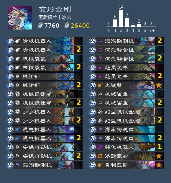 如今的机械法已经不再是曾经那个按费拍怪的铺场卡组了,他更像是当年的火妖法,需要囤手牌减费,然后打一波爆发。起手必留机械鲨鱼、怨灵之书和海底传送门,其他减费机械看情况留。打慢速一费没必要上机械,可以当做子弹来攒伤害,打海军贼一费随从该卖就卖,可以换两个频率,缓解血线压力。卡组基本上是四费开始发力,单回合极限伤害是33,实战中因为卡格子等问题,很难一回合斩杀对面,这时候一个塞布基本让对面绝望,场攻就能踢死对手了。卡组需要一定的熟练度,要算好费用,打出单回合的最大伤害,避免伏笔。