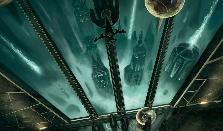 拉斐茵的圣所中盘旋着低喃;新卡佩纳的秘密与阴谋。这堵玻璃牆让这个史芬斯恶魔俯瞰她的城市,上方的彩色玻璃描绘着她的崛起、如何与大恶魔联手让天使殒落,以及又是如何增强了她预卜的能力。
