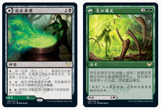 那么,最后那张看起来怪怪的瘟疫鼎镬是干什么用的呢?因为卡恩拿到这张牌后,可以施放背面的法术,复归爆发,可以回血+回收生物旅法,而且这其中还隐藏了一个组合技!当你有14点以上的献力,场上和坟场同时有卡恩和奇奥拉时,我们用奇奥拉重置夜殿,卡恩拿复归爆发,捞卡恩和奇奥拉,恢复生命,而复归爆发这张牌使用过后会放逐本身,大家都知道卡恩能从备牌拿神器,但其实它的完整描述是“从游戏外或放逐区”拿,因此,捞回的新卡恩可以再拿瘟疫鼎镬,施放复归爆发,新奇奥拉重置夜殿,产费,施放复归爆发,形成循环。循环的结果是你能获得无限的生命,如果献力多可以获得无限的费用,这个时候我们只需要施放正面的瘟疫鼎镬,起动第二条异能,你这回合获得了多少生命就磨对手多少张牌,而你本回合可以获得无限血,因此对手会被直接磨空。唉等一下!那你怎么出这个黑神器啊?哪来的黑啊?大家有注意备牌的不倦朝圣械戈罗斯嘛,和主牌的黑绿圈蔓生墓园嘛?是的,最后一次的循环时,最后的卡恩找备牌的宝窖或者戈罗斯,利用最后的奇奥拉重置宝窖出珍宝,或者出戈罗斯找黑绿地,重置黑绿地,就可以拍出这个大黑锅啦。