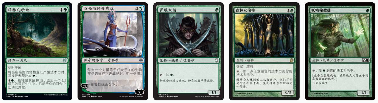 套牌前期产费人为妖精秘教徒、罗堰妖精、狼林庇护地、森林女像柱和巨怪唤师奇奥拉,它们都可以帮你在前三回合加速,两种1费人费用低,两费的庇护地和女像柱加速比较稳定,奇奥拉则能重置多个费用的地,不需要活过召唤失调,还能配合中期生物抓牌。