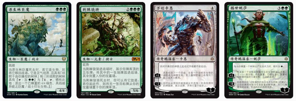 巨魔提供3点绿献力,死去后贴在树林上依然能提供献力,绿骁骑承上启下,提供很多献力的同时还能继续加速,翻5张也有较大概率翻到夜殿。妮莎既是威胁,也能重置夜殿爆费,而卡恩则为我们的套牌带来了维度,我们一会跟着备牌一块说。