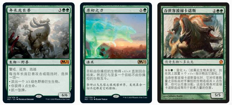 真正的备牌方面,我们大概只有四五个卡位可以留给可替换单卡,除了较为稳定的年长庞巨兽、吞世客外,我们也可以选用些去除,比如肯理斯化身、原初之力,针对绿色的猎人遭猎、蓝色的猎人印记(去除冰封巨物)也是不错的备选,大家可以根据自己所在的环境进行调整。