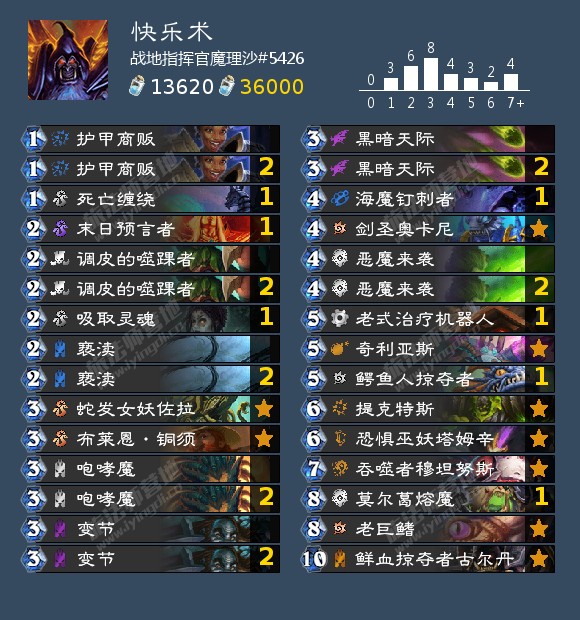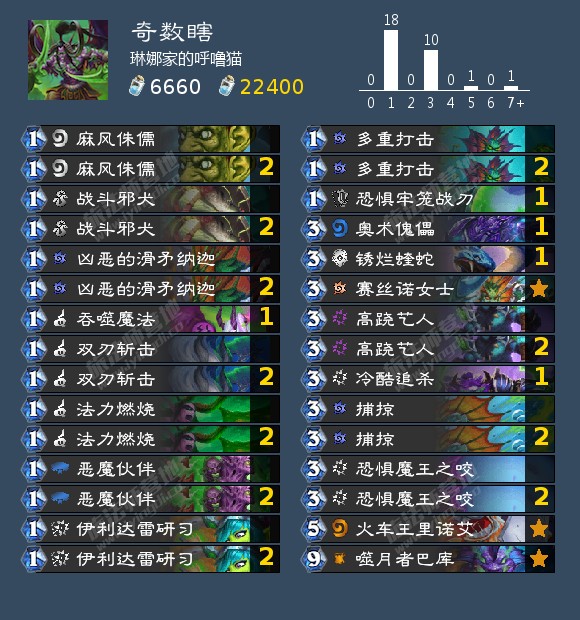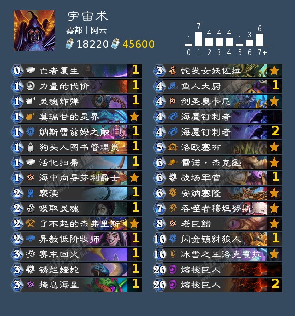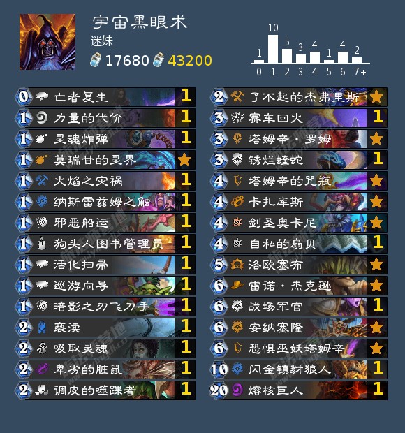 3.对阵术士,默认宇宙术,少部分机克。天梯目前我遇到比较主流的宇宙术是小碎骨的那套带灭霸的,总体55开。起手找恶霸,脏鼠。这个对局主要比运气,看谁破坏对手组件破坏得更好,或是你的恶霸封住了对面各种战吼功能牌取胜,甚至我曾经一把封了对面三回合靠站场踢死。毒鱼在这个对局一般留给老巨鳍。