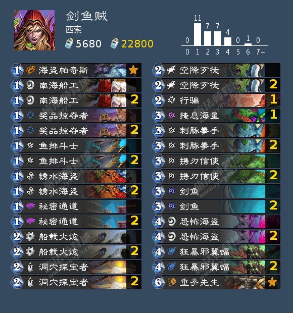 1.对阵盗贼,默认剑鱼贼,主要的上分食粮,这个赛季共对局13次贼只输了两次,其中有一次是重大失误输的。起手找aoe,吃刀和杀手蟹,有毒鱼套中的一张没冰钓也留。一费橙武和叠甲哥同时在手优先叠甲哥恶心他,这个对局前期压力处理好,保证中后期回血时场面安全即可,沙导组件会卡手的统统不要,活下来最重要。如果遇见的是鬼灵贼,虽然因为留牌信息差会吃亏,但是并非没有胜算,和以前一样利用脏鼠恶霸吃手手针对获胜。