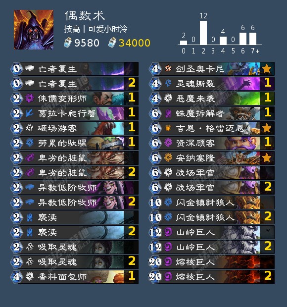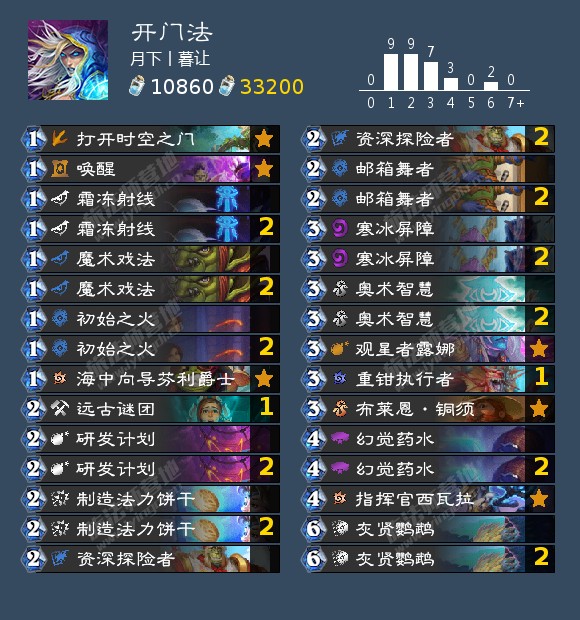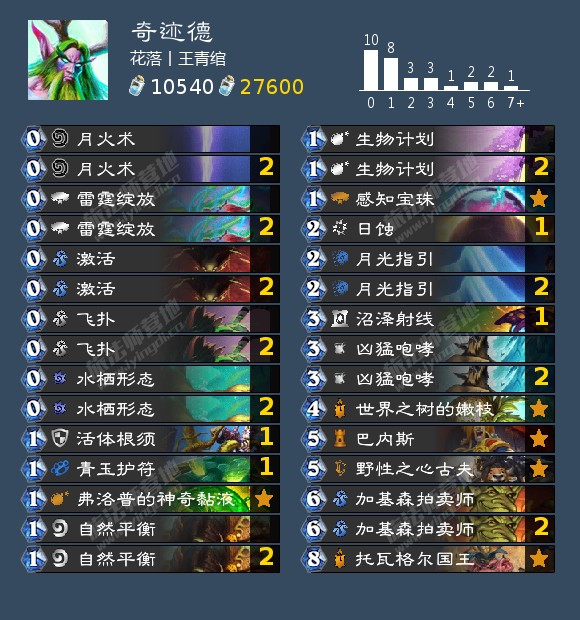 来自时泠的一套偶数术,它使用这套卡组打到国服第31名。(总战绩是1061场54%胜率,这猪很执着,一直没开新卡组格子,所以几个赛季的战绩被累计了。)
