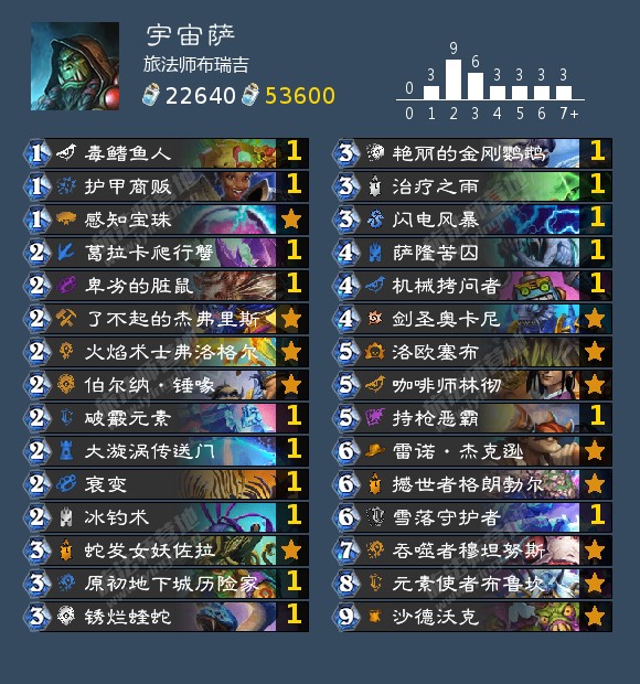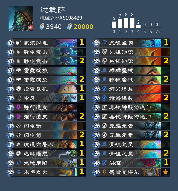 来自旅法师布瑞吉的一套宇宙萨,他使用这套卡组以91场65%的胜率打上了传说。