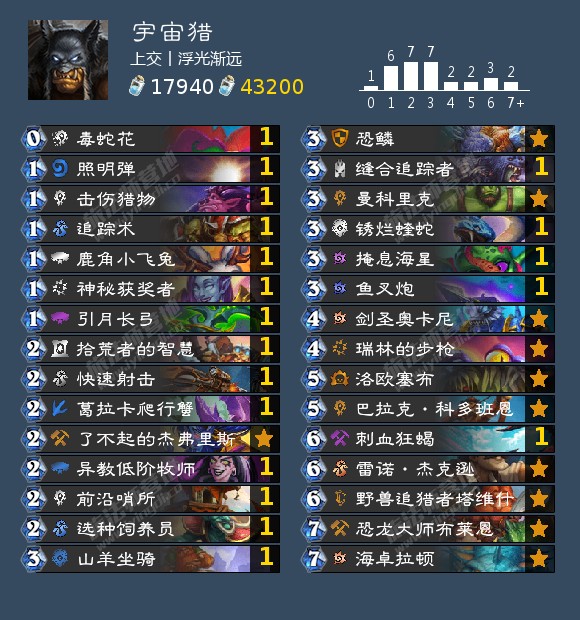 来自上交丨浮光渐远的一套宇宙猎,它使用这套卡组以48场67%胜率打到了270名。