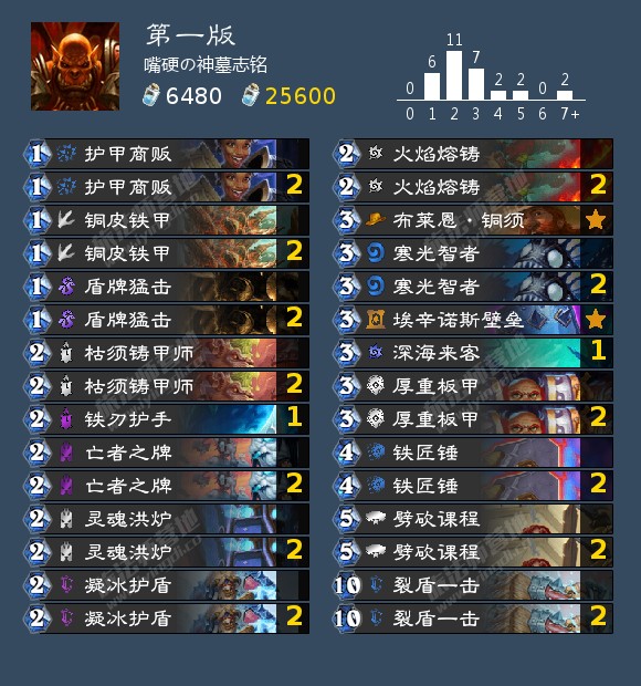 回到正题,我们讲一下构筑变化上带来的差异,第一版墓志铭是冲着卸手牌去的,他带了相当多的叠甲卡,整体构筑灵活性是被拉下来了,同时他这么构筑对裂盾一击的需求量无形之中是拔高很多的,这也就导致了他当时面对版本初海盗战那种很容易破盾和多轮场面的构筑时极度的劣势,你解完一波还有一波,同时护甲保不住,裂盾一击和铁刃护手都被卡了,过牌也就变相转不动,整个卡组就僵住了。