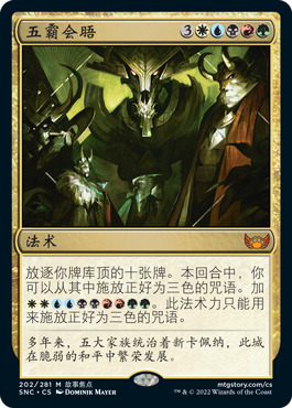 - 由于这个系列的重点在三色弧上,我们希望把那些令人兴奋的多色牌聚焦色三个颜色上。别忘了这系列裡唯一的一张五色牌—五霸会晤,也是把重点放在三色的主题上。