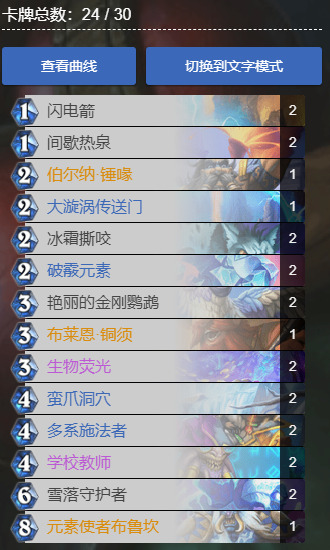 这里不做太多解释,我相信玩法强萨的应该都无异议。唯一的区别可能在大漩涡传送门带一张还是两张,实战中会发现往往两张真的会很卡手,一旦两回合连抽两个大漩涡,直接凉一半,打铺场卡组无非超生德,但前提也要配合法强才能解场,对方无场面为了战场及配合多系施法者过一张真的好蠢不推荐!带一张还是很有必要的,补刀、破盾、自然法术过牌、站场。