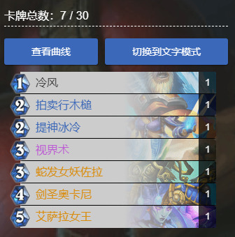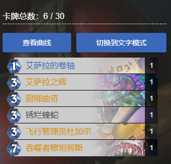 - 艾萨拉之辉:这是一张让人又爱又恨的牌,恨的是手上有它没伤害,爱的是提前启动打蒙对面,视情况而定配合冰霜法术回甲。