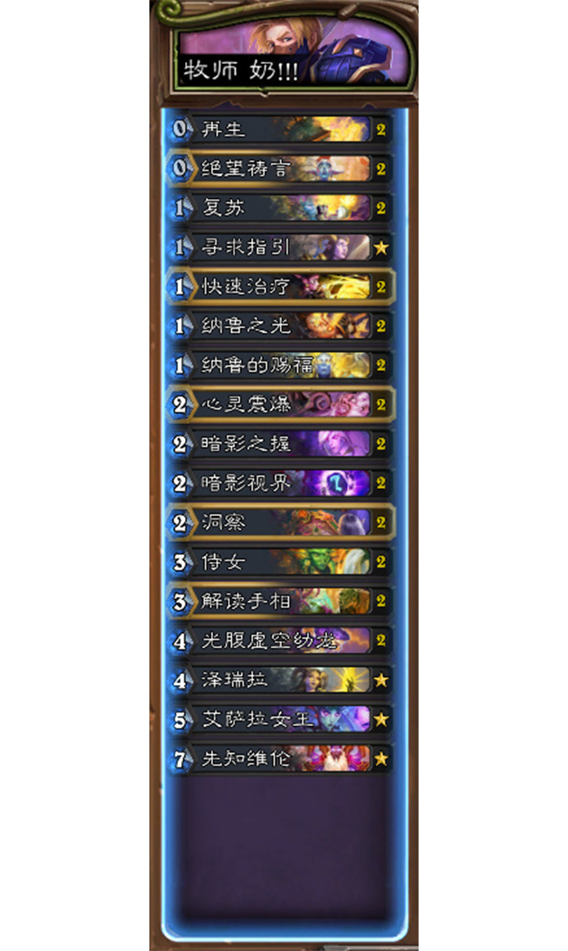 到了现在,沉没之城版本加入了很多牧师过牌,女王也能极大增加毒奶牧上限,我重新对毒奶牧进行了改进设计,放弃了一定程度的速杀(其实极限速度也很快),使其变为一个半控制卡组,在有着优秀的操作者下,胜率能接近60%!!