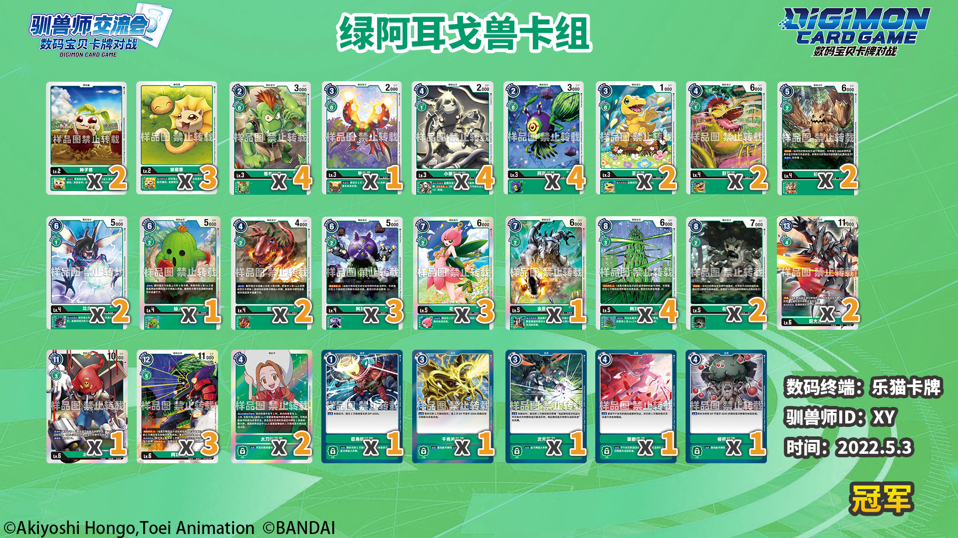 上周绿阿耳戈兽卡组仍是环境中的常青树,以高速进化、高效铺场能力著称,是玩家入门的上佳之选。有别于一直占据环境前列的绿泰坦兽卡组,绿阿耳戈兽卡组在究极体终端的投入上选择了“BT2-050 阿耳戈兽”,其在特定条件下获得的《安防攻击+1》效果也能给对手带来更有效的打击。“XY”选手的构筑中甚至还投入了Lv.4的“BT2-045 阿耳戈兽”,将《吸收进化》这一主题贯彻到底!本次除了大家耳熟能详的核心“BT2-047 阿耳戈兽”,“XY”选手还大胆尝试投入了“BT1-068 小锹形虫兽”,虽然在Lv.3多了1费进化,但在绿色本身就能以较低费用进化的Lv.4、Lv.5数码宝贝帮助下,整个进化过程依然顺畅,并且其进化源效果《安防攻击+1》还能弥补卡组整体对安防攻击不足的短板,使整体更具攻击性与威胁,若是能配合“BT1-083 巨大古加兽”的《贯通》效果,也能相比以往更快地拿下胜利。