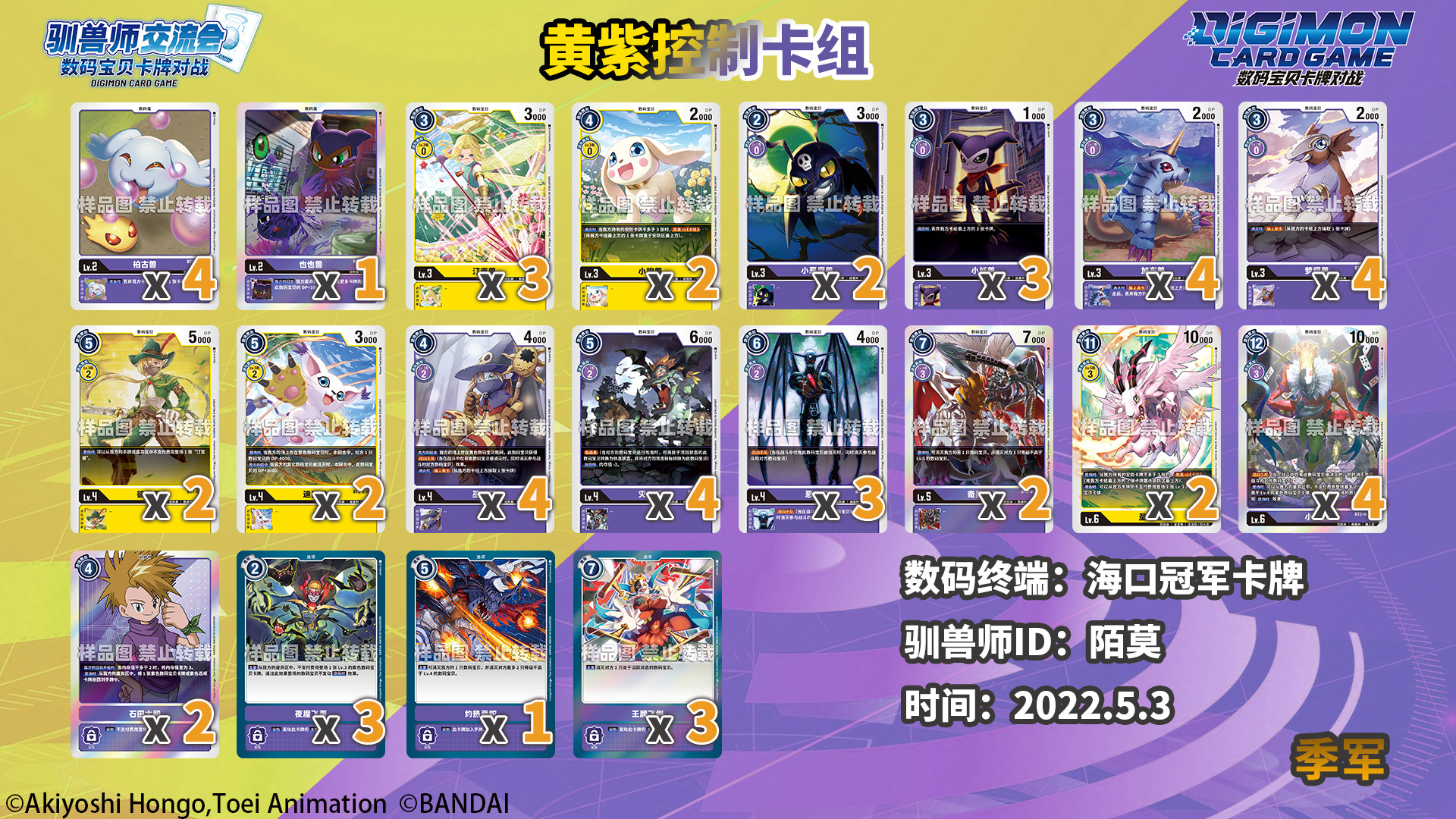 黄紫控制是以紫色为主,黄色为辅的控制型卡组,其中的Lv.6数码宝贝不依赖进化成型,而是通过直接登场来发动实用效果。在黄紫双色的相辅相成下“BT2-036 迪路兽”与“BT2-071 巫师兽”能将自身效果完全发挥:无论是削减对手数码宝贝的DP,还是利用《同归于尽》效果来施压都显得非常实用,配合紫色“BT2-020 梦貘兽”消灭时效果,或配合黄色“BT1-056 彼得兽”、紫色“BT2-080 小丑皇”的登场时效果,都能实现较大收益,并对对手形成一定场面压力。而且即便陷入逆风的局面,也可以直接登场“BT2-039 圣龙兽”来拖慢对手节奏,争取扭转局面,且其攻击时效果也可以直接登场手牌中的黄色Lv.3数码宝贝。可以说在玩家的周全考虑下,才诞生了这套心思缜密的控制型构筑。而在对战中仍然需要选手有较强的操作技巧与全局意识来掌控全局走向。