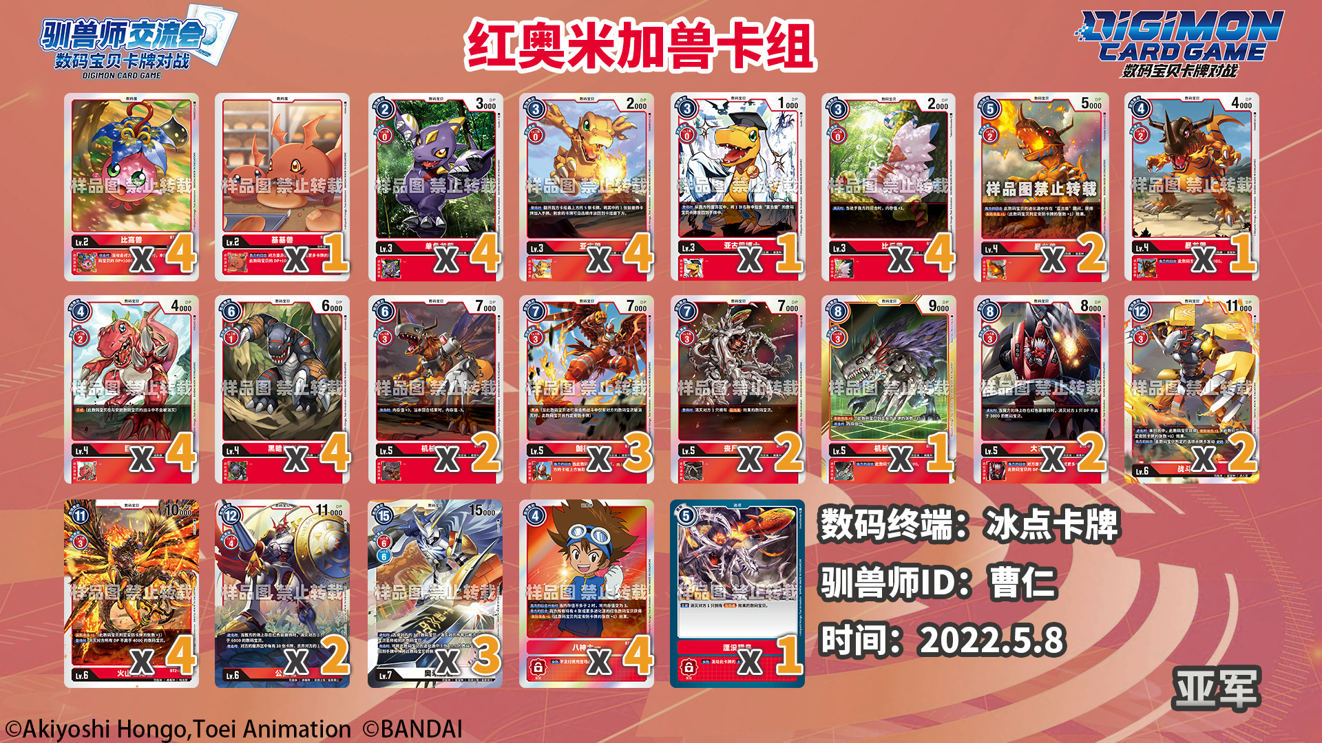 “曹仁”选手使用红奥米加兽卡组在青岛冰点卡牌5月8日的10人比赛中获得亚军,本次上位卡组类型分布统计中,共统计到了4套该类型卡组,使用率1%。