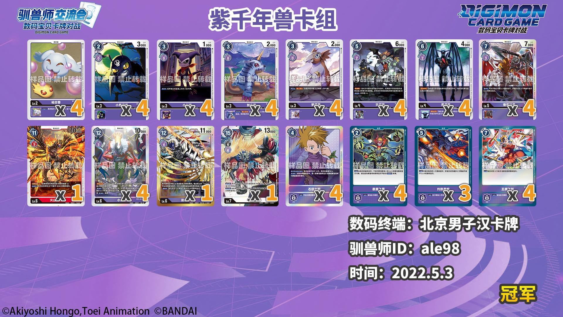 “ale98”选手使用紫千年兽卡组在北京男子汉卡牌5月3日的24人比赛中夺得冠军,本次上位卡组类型分布统计中,共统计到了21套该类型卡组,使用率7%。冠军卡组构筑分布中统计到了6套该类型卡组,占比8%。