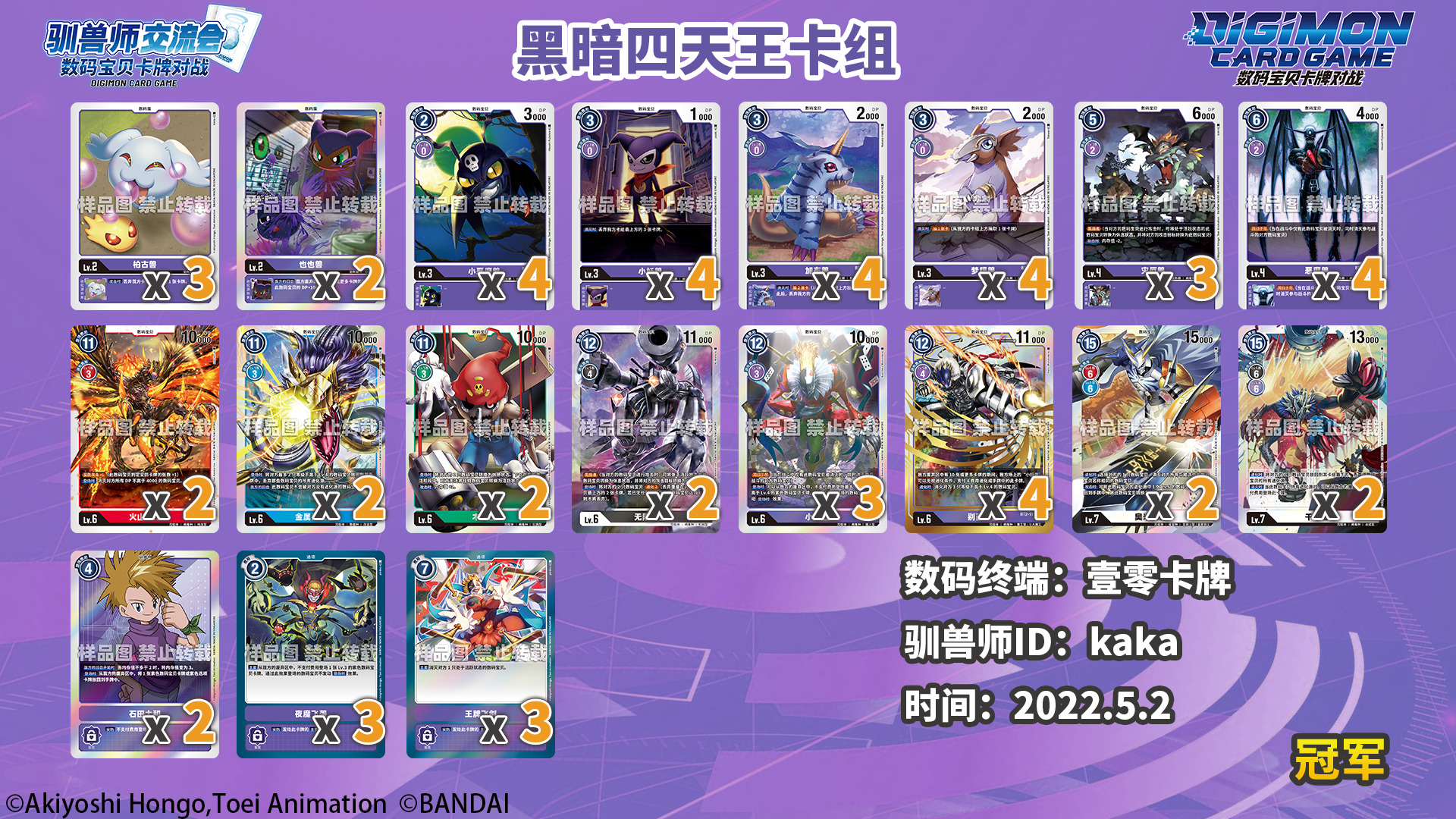 “kaka”选手使用黑暗四天王卡组在深圳壹零卡牌的5月2日的18人比赛中夺得冠军,本次上位卡组类型分布统计中,共统计到了4套该类型卡组,使用率1%。冠军卡组构筑分布中统计到了3套该类型卡组,占比4%。