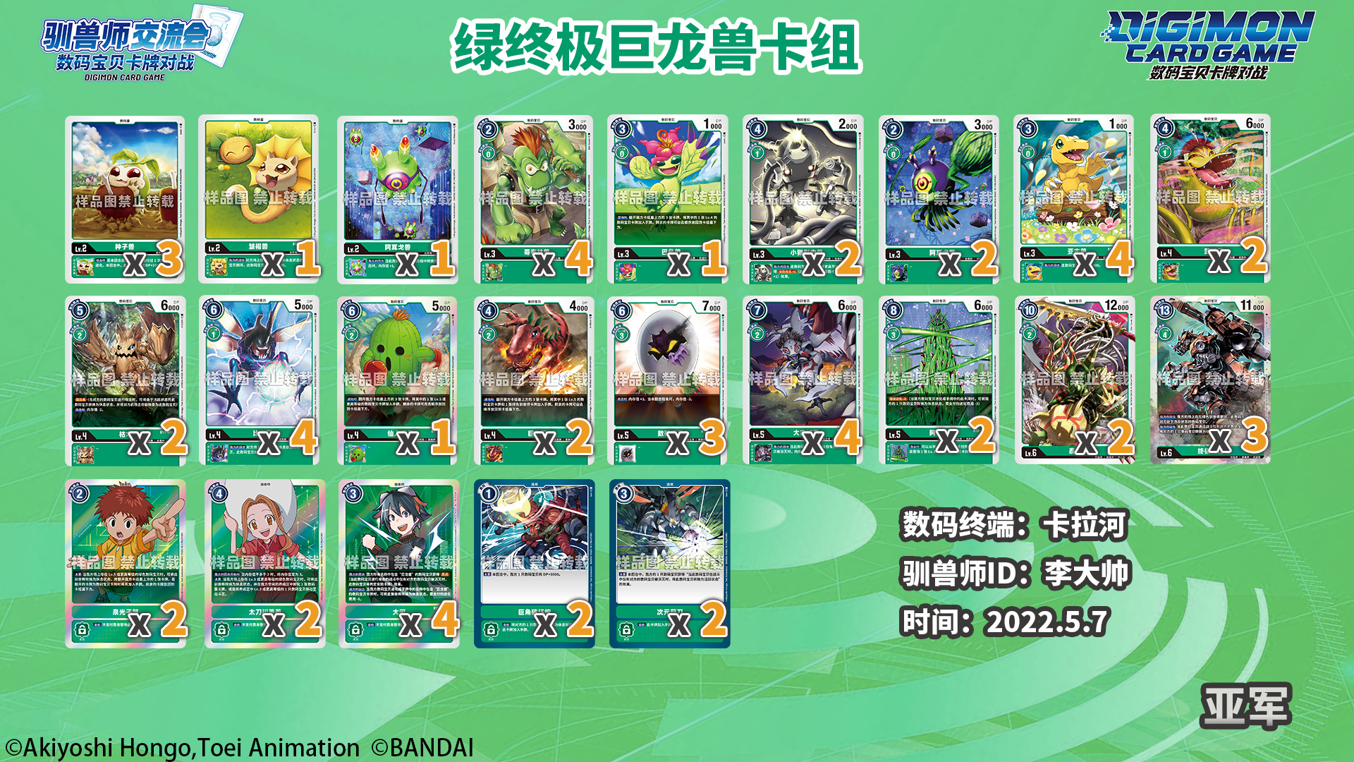 “李大帅”选手使用绿终极巨龙兽卡组在北京卡拉河5月7日的12人比赛中获得亚军,本次上位卡组类型分布统计中,仅统计到了1套该类型卡组,属于其它板块。