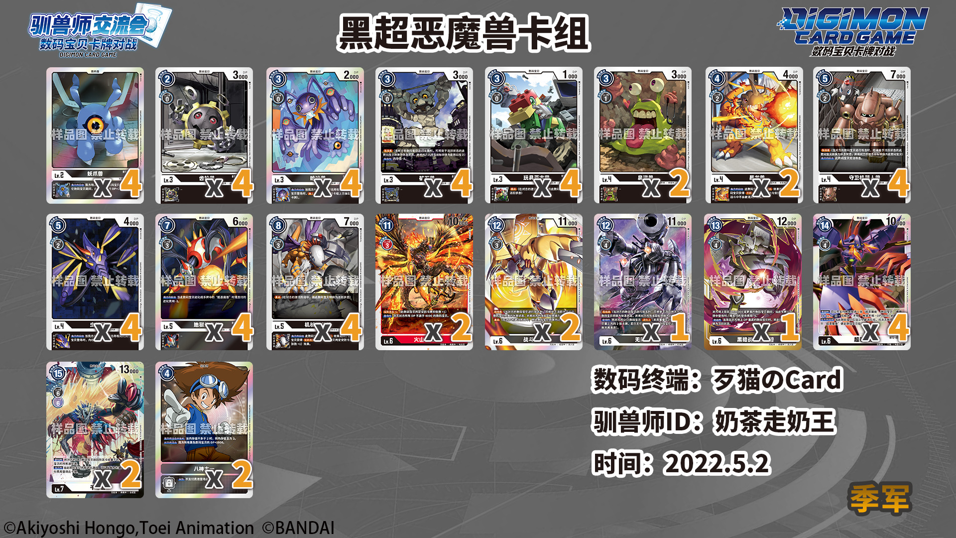 “奶茶走奶王”选手使用黑超恶魔兽卡组在东莞歹猫のCard 5月2日的8人比赛中获得季军,本次上位卡组类型分布统计中,仅统计到了1套该类型卡组,属于其它板块。