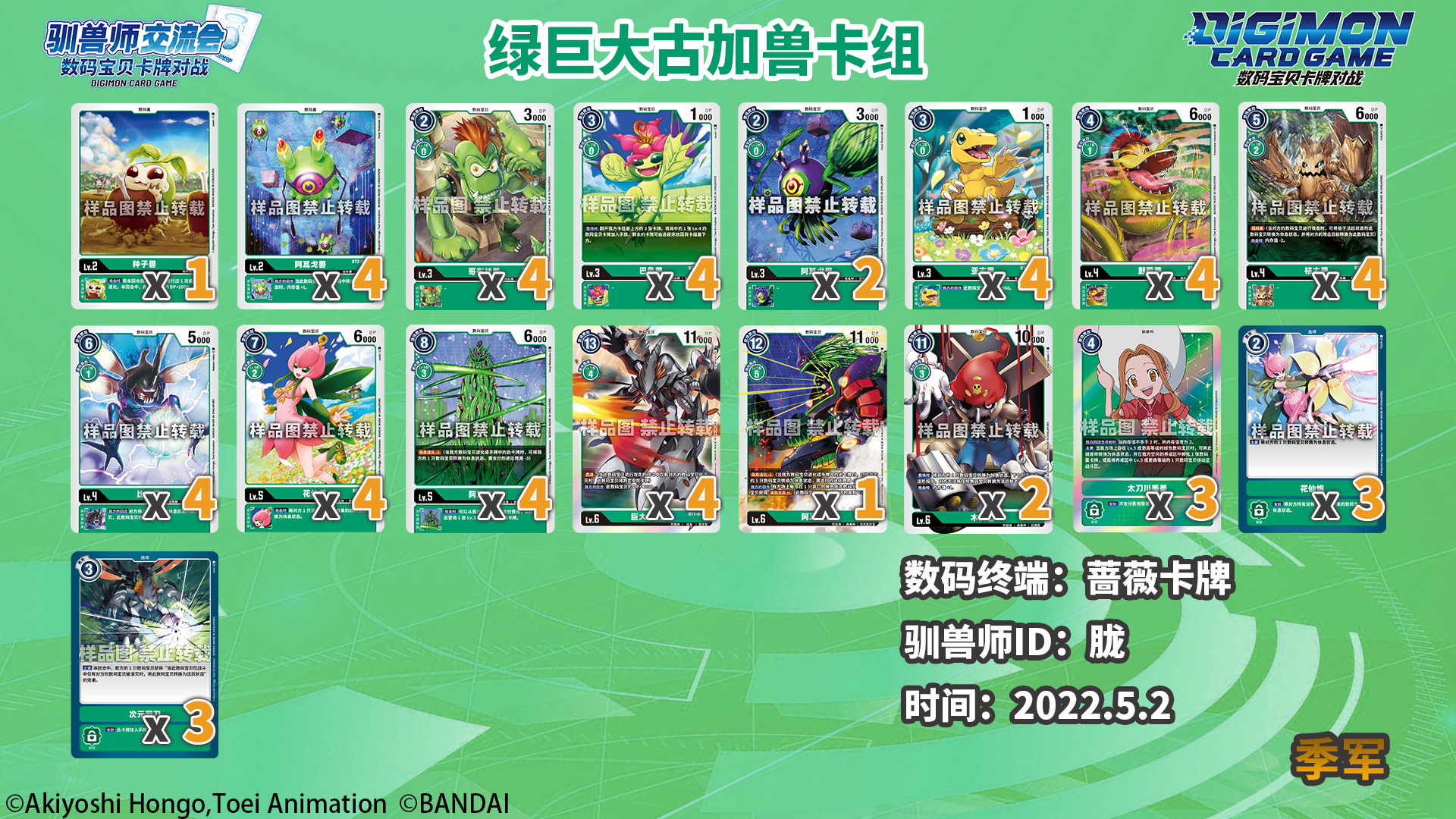 “胧”选手使用绿巨大古加兽卡组在福州蔷薇卡牌5月2日的6人比赛中获得季军,本次上位卡组类型分布统计中,仅统计到了1套该类型卡组,属于其它板块。