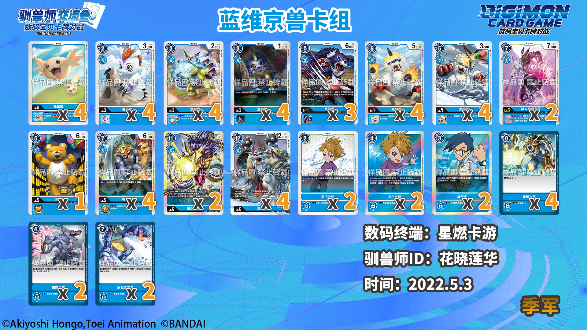 “花晓莲华”选手使用蓝维京兽卡组在佛山星燃卡游5月3日的8人比赛中获得季军,本次上位卡组类型分布统计中,仅统计到了1套该类型卡组,属于其它板块。