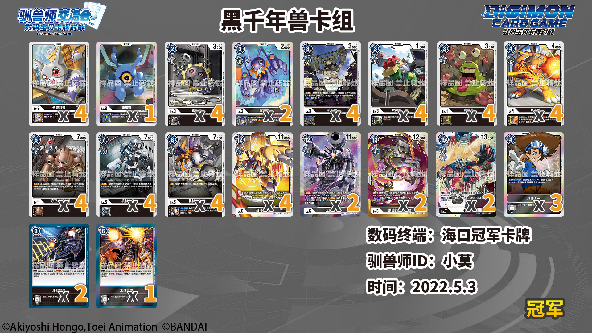 “小莫”选手使用黑千年兽卡组在海口冠军卡牌5月3日的12人比赛中夺得冠军,本次上位卡组类型分布统计中,共统计到了6套该类型卡组,使用率2%。该类卡组在冠军卡组构筑分布中属于其它板块。