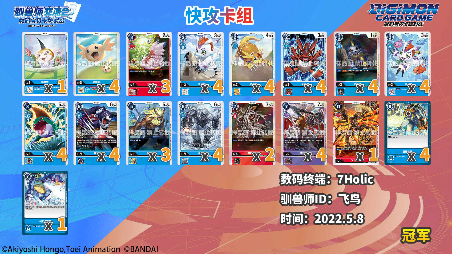 快攻卡组是可以兼容各色数码宝贝的前期速攻型卡组,上周的使用率也较为平稳。与常见的蓝绿快攻卡组不同的是,本次快攻卡组的构筑以蓝色为主,结合了红色与紫色的卡牌,投入了相应的“针对卡”,在18人的比赛中脱颖而出!投入“BT2-010 比丘兽”在其与对手安防区的战斗中被消灭时也能增加自己的内存值;投入“BT1-023 丧尸暴龙兽”可以有效针对对手拥有《阻挡者》效果的数码宝贝;而投入“BT2-077 奇美拉兽”更加扩大了对对方Lv.5或以下数码宝贝的打击面,能有效干扰对方的进化展开节奏,为快攻扫清障碍。加上“ST2-13 重锤火花”与“BT1-035 狮子兽”能为快攻战术带来更多内存值,让自己的高等级数码宝贝登场更为方便。此构筑想法非常有针对性,对轻松消灭对方具备《阻挡者》效果的数码宝贝进而让己方数码宝贝冲击对方安防区,为快攻战术拓出更加多样的变化。
