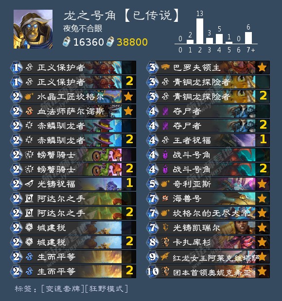 【号角夺尸者体系+**龙体系+三套解场】前两天自创的套牌【龙之号角】骑打上钻五后,针对五级后环境优化后一口气冲上传说,这也是本人第一次使用原创卡组上传说,作为圣骑士人柱力可以说是非常激动了😭。前期可抗剑鱼贼,后期也有一定的压制力。大概打法可以分为三个阶段:1,前期拼刀,可以制衡海盗战,海盗战以下略有优势。弱于剑鱼贼,所以遇到剑鱼贼要留一套,留牌生平一套的优先度比号角高。其余的对局都可以尽量换成号角和夺尸者。2,中期转控制中速,由于号角+驭龙者的配合,中期不太可能缺资源,但是也要规划(纠结)好(不交一套我会不会?交完一套我能不能活?)坎格尔大军配合潜水艇可以说是中期无敌组合。3,后期龙体系博弈,卡扎库杉的到来,让圣骑士除了元气弹和天启(还有标准铁拳一套)外多了终结比赛的手段,圣骑士的青铜龙探险者让卡扎库杉触发代价减小到非常低,甚至可以说相得益彰,总之非常适配。本卡组讲究一个因时制宜,抉择点比较多,操作感好。小tips:坎格尔无尽大军拉出的潜水艇自身也带一只钩钳,最好的使用时机是挖宝后补充手牌资源。喜欢圣骑士的老哥请一定试试,狂野目前的环境中使用时,有一种梦回奶骑时代的体验。