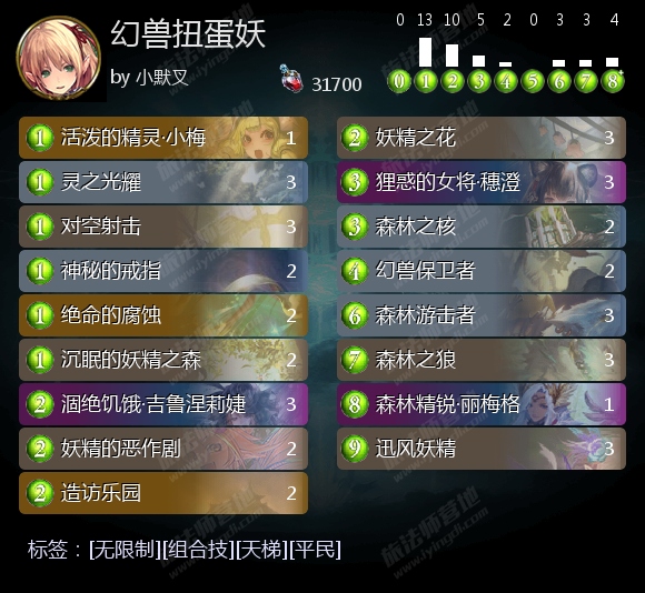 在穗澄之外,这套牌投入了1、4、6、7、8、9费用的精灵随从,但其中的活泼的精灵·小梅仅有1张,且会在启动组合技的当回合触发瞬念召唤效果上手,因此不会干扰穗澄效率。而余下的随从中,仅有1张的森林精锐·丽梅格能提升上限,增加斩**害,帮助第2张穗澄拉出足够的随从。倘若因拉出丽梅格而未能拉出保卫者,这套牌也能通过进化迅风妖精,在对手没有墙和减伤的情况下打出总计21点斩杀。
