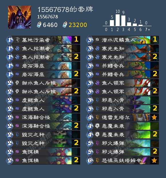 简单说:能玩!但是我太菜了!(能打过任务猎的术士卡组,这版本玩术士都能理解这句话的含金量吧)说明: 缺点: 1.很明显,这套牌法术只有邪能法术和岩石海底+鱼饵桶,意味着没有暗影法术的续航解场和小塔姆辛的资源。 2.德雷克塔尔的存在意味着没有高费随从。(我本来想单吊雷诺的结果发现不配) 优点: 1.邪能法术:他可以打脸,恶魔来袭,邪火爆弹10-12点伤害,这部分伤害是可以打脸的!满编毁灭之种,为了洗邪能裂隙进去,配合邪火爆弹,让伤害尽可能的打出三点。同时邪能裂隙能尽可能的扩大你的场面。也防止你出现空场的情况。(两张毁灭之种8张塔姆辛英雄牌3张,要抽不出来那是真脸黑好吧)还有所有邪能法术的群解都是正向解场。带了张墓地污染者,说实话纯偷鸡卡,复制一张恶魔来袭或者邪火爆弹多打三点伤害,同时也算个一费节奏,不然一费拍个鱼人招潮者,个人感觉挺蠢的。 2.德雷克塔尔:这牌没什么好说的对吧,术士打不过的职业都在用,古尔丹用一下怎么了?全套卡组只带了一张非鱼人(你要拉出来算你脸黑)。先手四费拍德雷克塔尔,五费配合岩石海底+鱼饵桶,你甚至还能拍个二费“巨型”鱼人。后手三费跳币四费岩石海底+鱼饵桶,至少还能拍个“大”招潮者。实战经验(算是吧):本来是带了张芬利的,可他的机制是交换牌库,你拿一手的邪能裂隙挺搞心态的。而且芬利洗进去鱼饵桶的buff就没了,所以就下了。还有探底这个机制也是,你塔姆辛英雄技能会洗你的探底牌。两张融合怪很吊,这卡是真的吊好吧,有一点注意,可以发现恶魔去找深渊惩击者,打脸打三真的有用的。邪入膏肓带了两张,前期不要省,有两张。邪能裂隙,源源不断保证你的场面这是传统鱼人术没有的(这里说一嘴内战,我好像就赢了两把,天梯术士见到自己人跟打了鸡血一样)。没啥了,好像就怎么多。哥们是真菜,好久没打天梯了,没打两把就猪脑过载。这卡组上手也不难,鱼人术玩过两把的,就直接可以上手。人菜但不希望我的卡组被埋没,所以感兴趣的可以试试!最后的最后,本人没怎么发过贴(第二回吧),如果有什么使你观感体验不佳的地方,请保持理性不要喷我。还有,欢迎提出建议!术士!未来可期!
