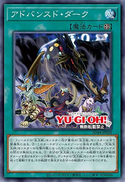 ①:场上的「宝玉兽」怪兽以及墓地的「宝玉兽」怪兽全部变成暗属性。②:只要这张卡在场地区域存在,成为「究极宝玉神」怪兽的攻击对象的怪兽的效果只在那次战斗阶段内无效化。③:自己的「宝玉兽」怪兽进行战斗的伤害计算时,从卡组把1只「宝玉兽」怪兽送去墓地才能发动。那次战斗发生的对自己的战斗伤害变成0。
