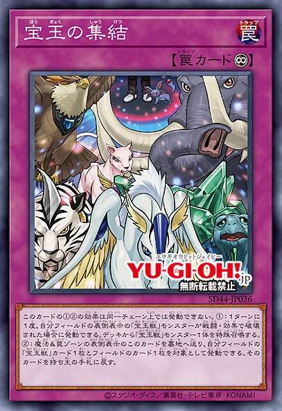 这张卡的①②的效果在同一连锁上不能发动。①:1回合1次,自己场上的表侧表示的「宝玉兽」怪兽被战斗·效果破坏的场合才能把这个效果发动。从卡组把1只「宝玉兽」怪兽特殊召唤。②:把魔法与陷阱区域的表侧表示的这张卡送去墓地,以自己场上1张「宝玉兽」卡和场上1张卡为对象才能把这个效果发动。作为对象的卡回到持有者手卡。