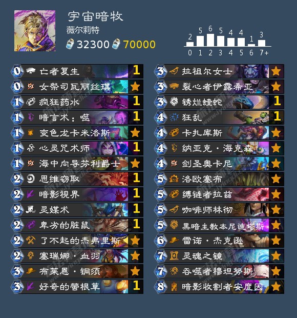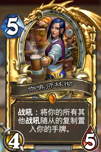 还有咖啡师这张卡,我在蛇发女妖和咖啡师之间选择了咖啡师,虽然蛇发女妖比较灵活,但是在面对战吼萨时还是咖啡师的罩子比较亮,再加上牧师在313倒了之后,面对OTK几乎毫无还手之力,个人认为以其靠运气来赢OTK倒不如让卡组更快乐些。