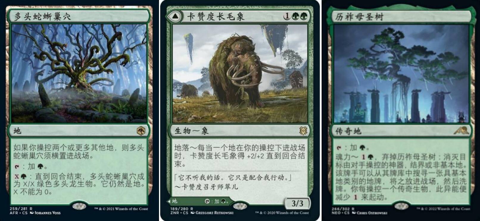 为什么要使用更多的地牌?因为现在的地都太棒了!你可以在套牌中放入多头蛇蜥巢穴、卡赞度长毛象、历祚母圣树、或者一张树林来让你在其他人的历祚母圣树下不那么脆弱。我的第二个秘诀:复制一个套牌然后添加一两张变人地。
