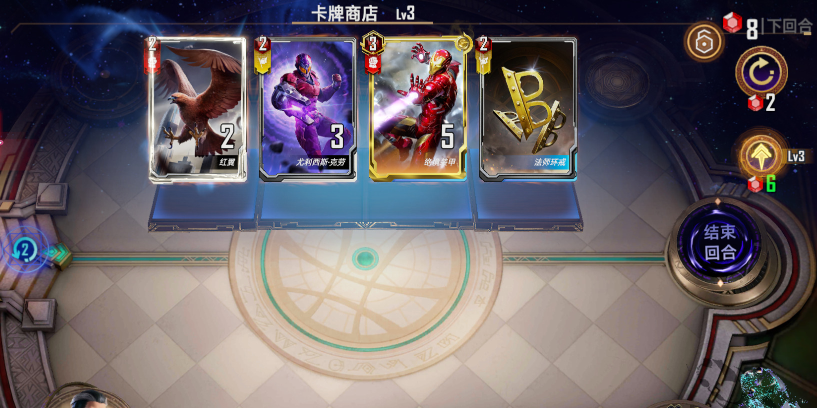 - 例如以下场景,我发现对手是神盾局,前期战力偏弱,我会选择买下前三张牌稳定血量: