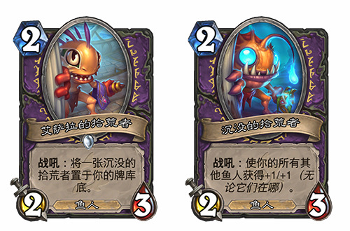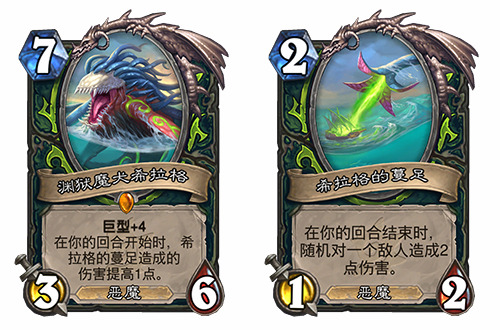巨型随从当然是沉没之城的主角,但他们中有几个的表现还不尽人意。我们是希望每个职业都能有一个令人兴奋的、可用的巨型随从的,就像奥特兰克的英雄牌那样,这算是我们的软目标,所以我们对希拉格和黑水巨鳗进行了调整。