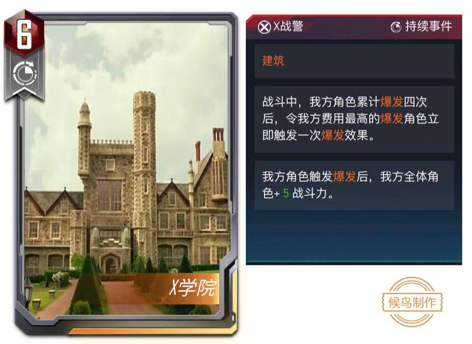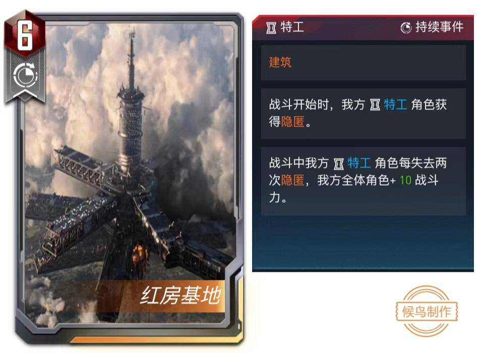 作为新设定的词条,【建筑】无疑是作为持续事件存在的,当一座建筑落成时,它能持久的为超级英雄们提供保护或支援。在卡牌设定中,带有【建筑】词条的卡牌往往具有强大的作用,具备扭转战局的能力。一方面,我们不想让【建筑】牌的作用被削弱,另一方面,其过于强大的收益也需要加以限制。因此,在保留特色的同时,我们考虑增加其使用机制。当玩家想要在准备阶段打出【建筑】牌时,必须保证此【建筑】牌是此阶段打出的唯一一张事件牌,若在此阶段中曾打出过事件牌,则建筑牌变为不可打出状态,直到下一个准备阶段。另外,由于传奇建筑本身的独特性,事件区内不允许同时存在两张【建筑】牌,当打出一张新的【建筑】牌时,则会自动卖出事件区内的【建筑】牌。