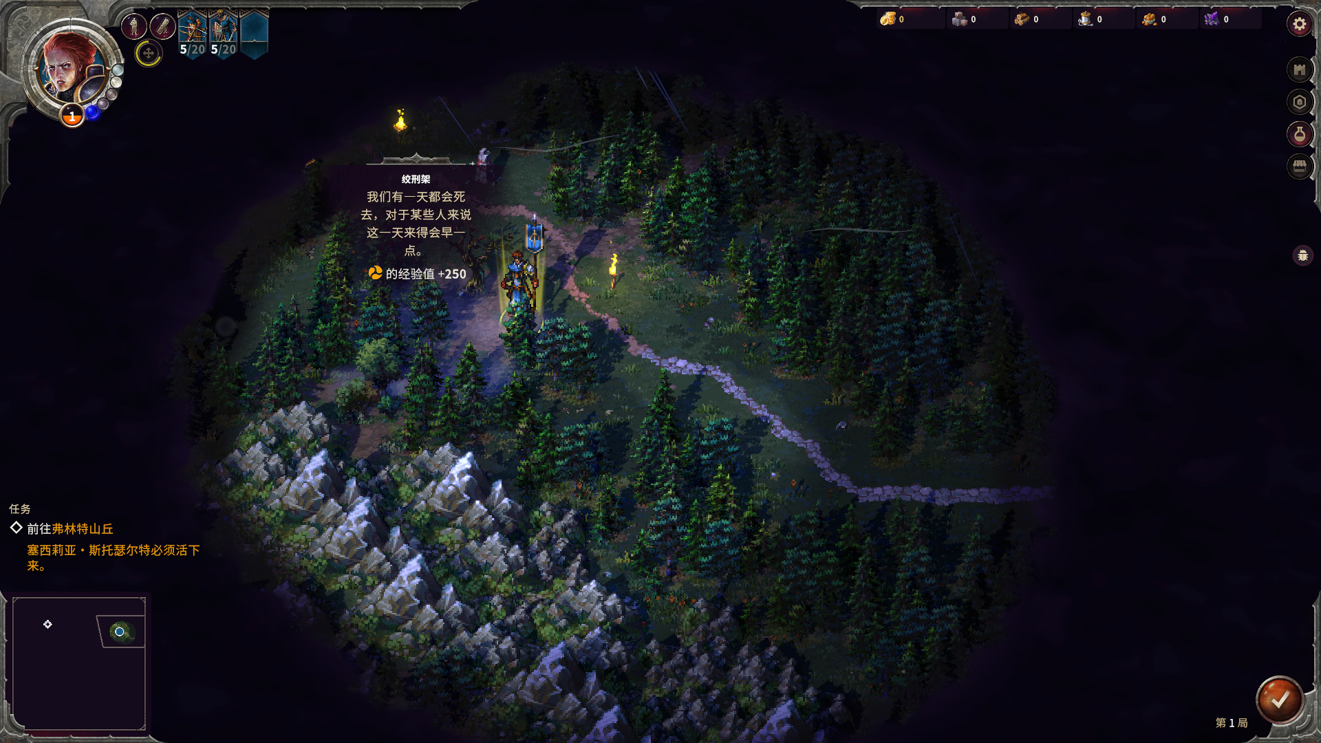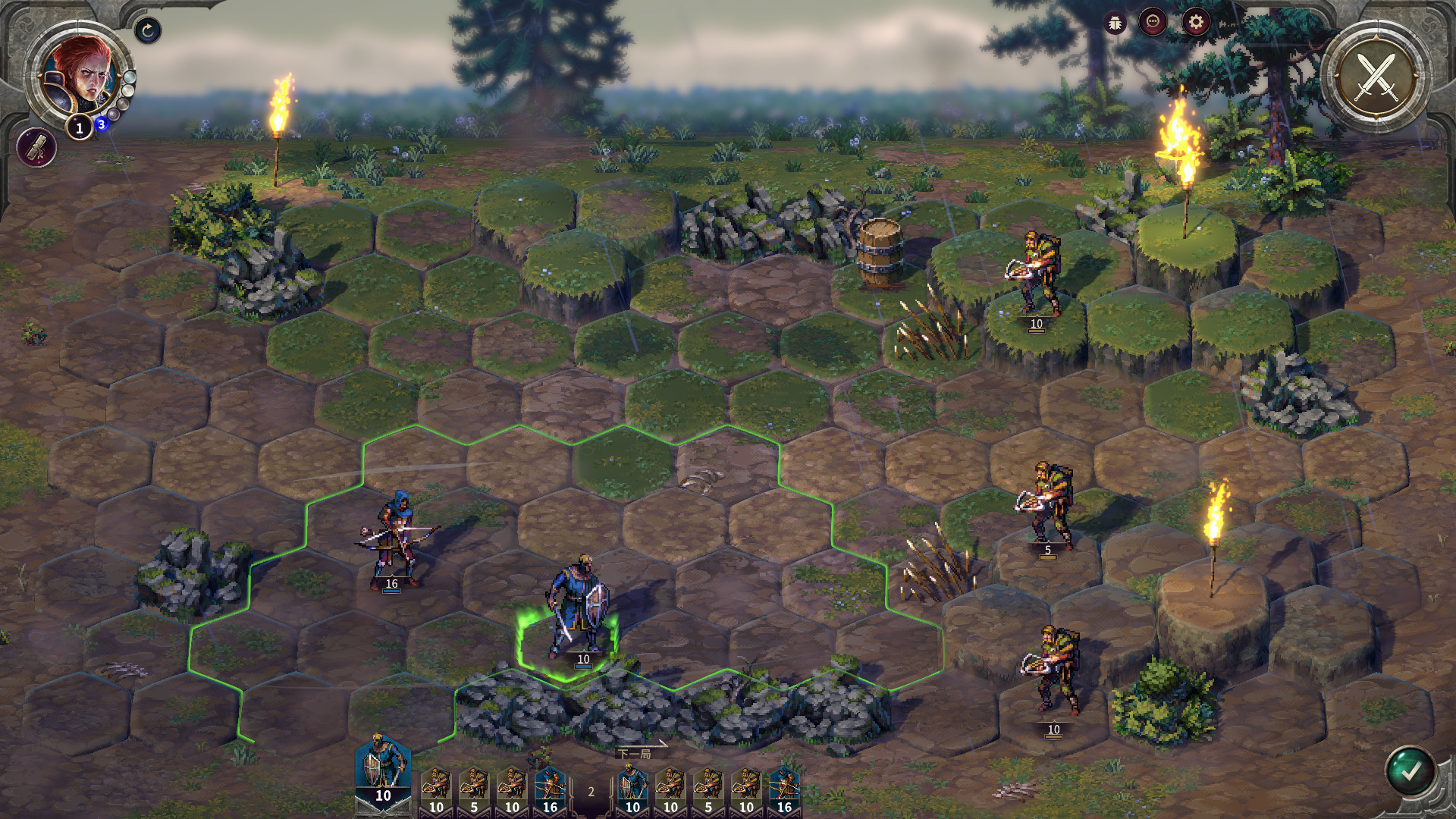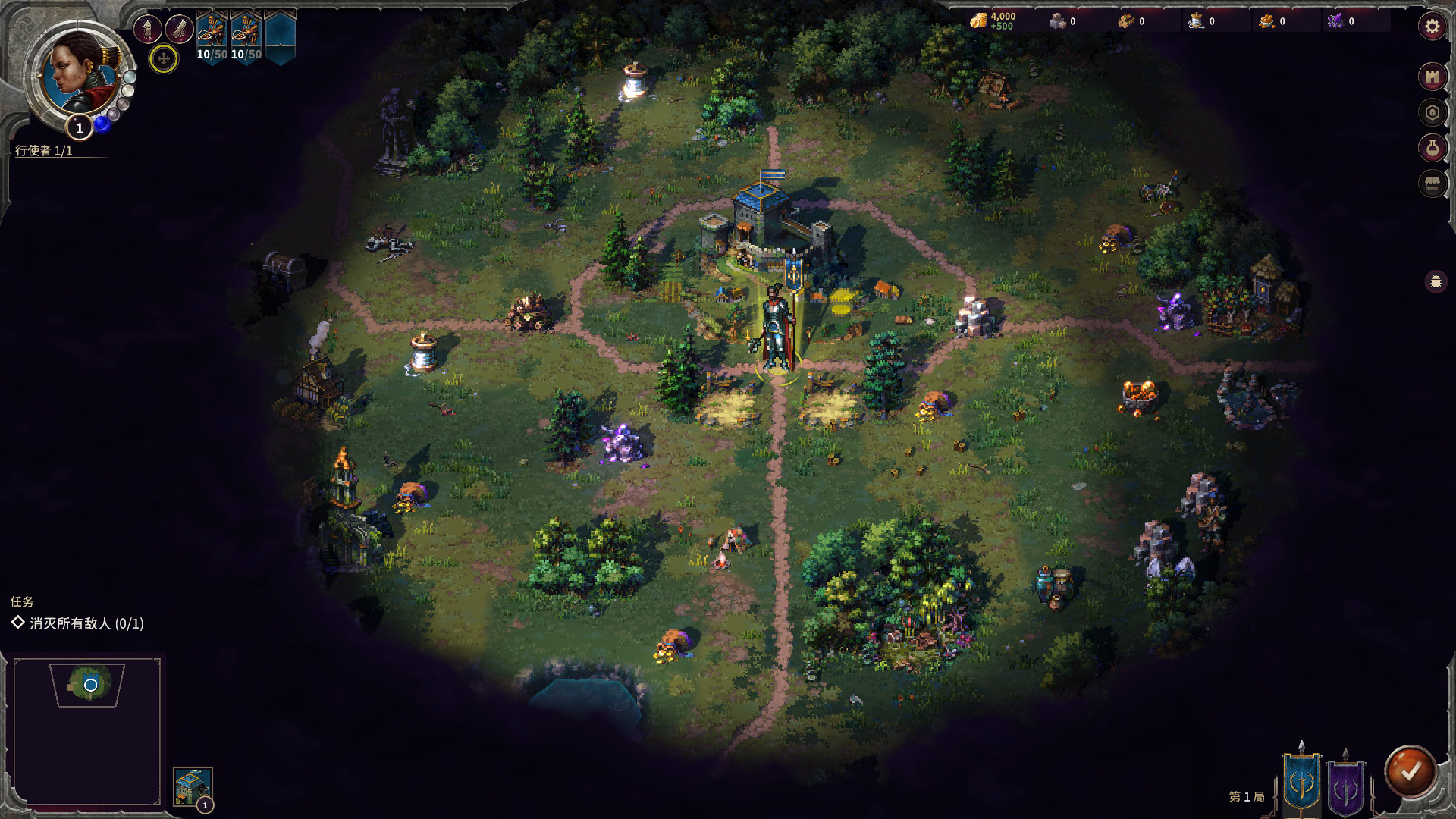 作为新手关卡入手很简单,刚开始路就一条,直接对着路上可以互动的单位右键就可以前往了。人物也有移动力限制,用完了就只能回合结束。