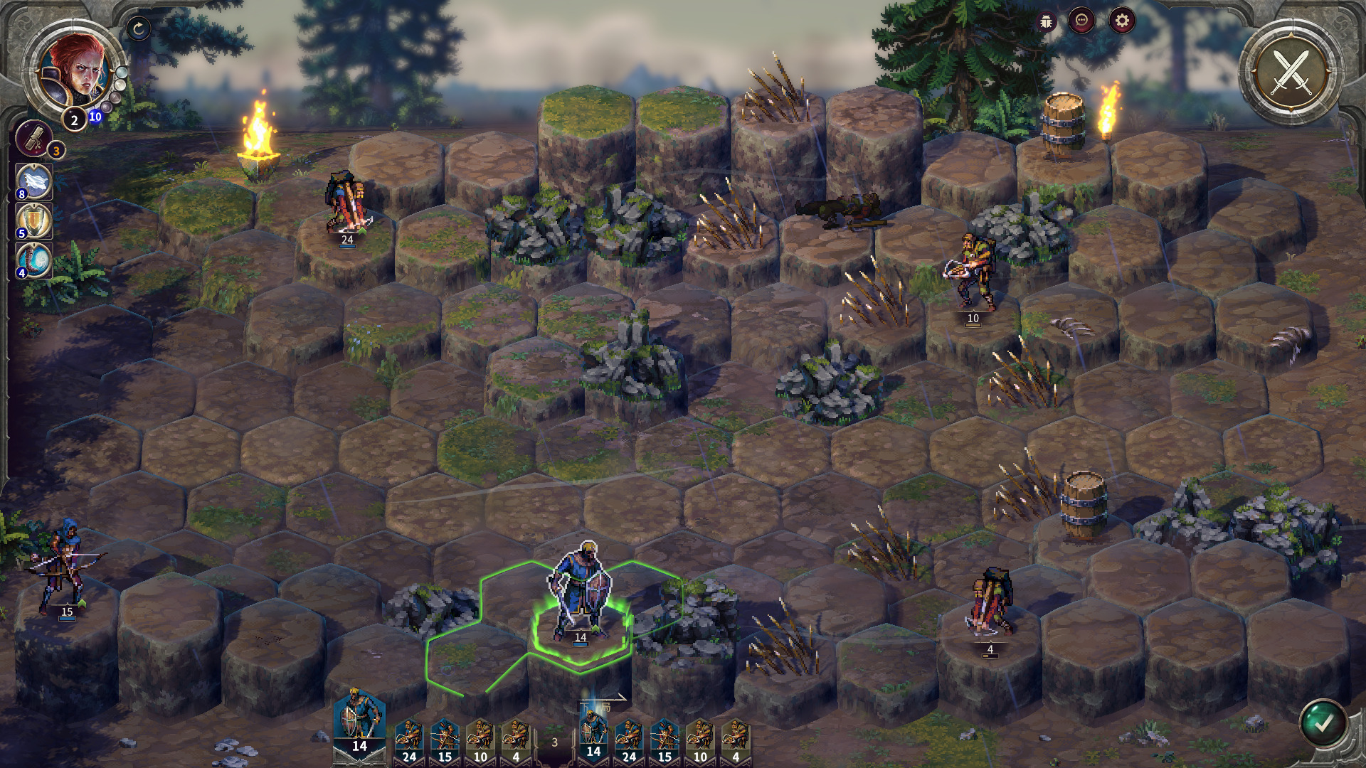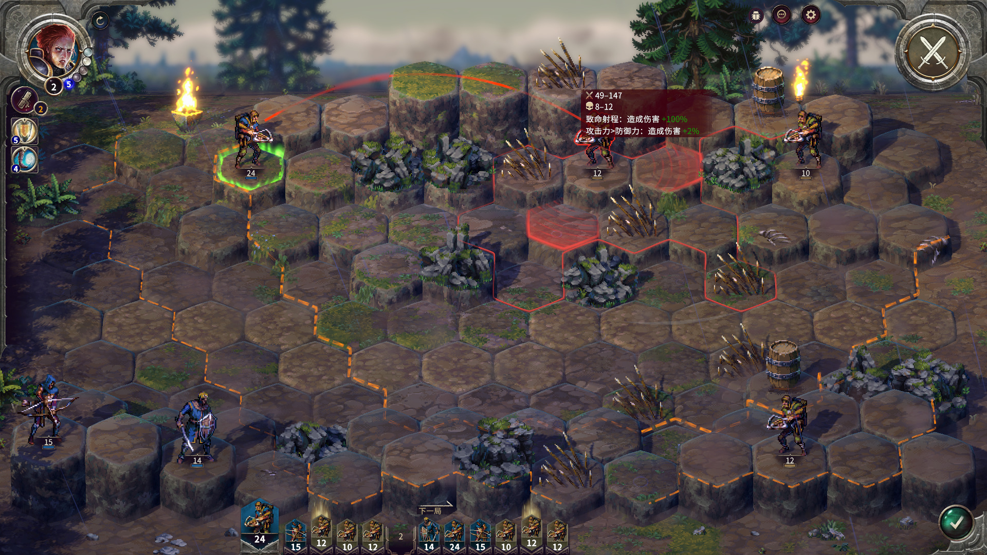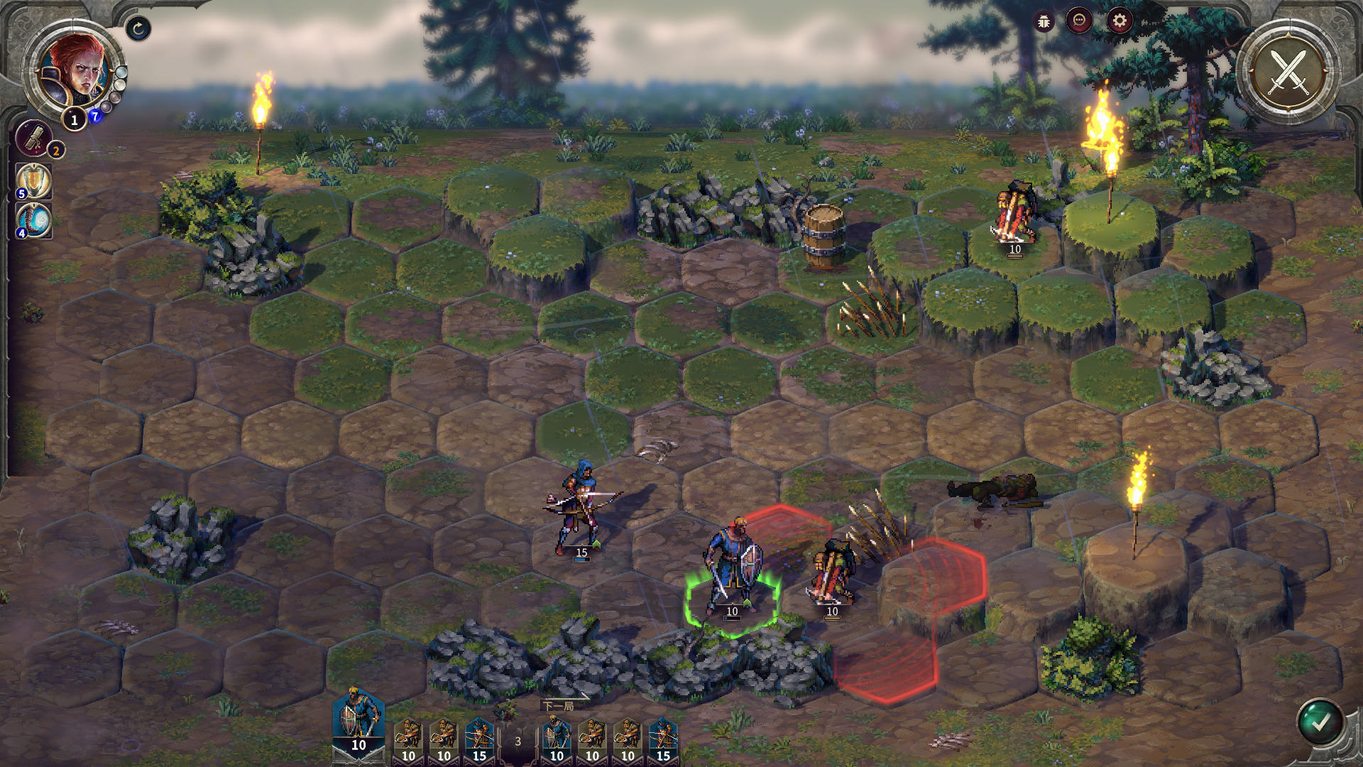 作为新手关卡入手很简单,刚开始路就一条,直接对着路上可以互动的单位右键就可以前往了。人物也有移动力限制,用完了就只能回合结束。