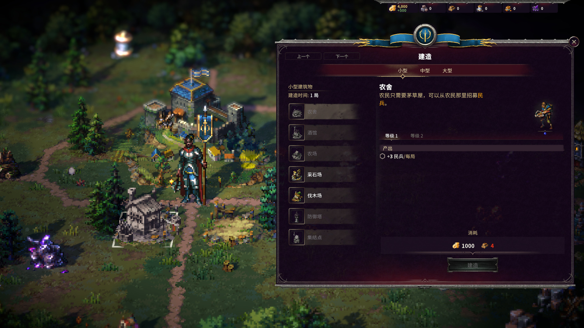 征服之歌没有一个单独的城镇界面,取而代之的是你直接在**图上点击城镇附近的可建设地块来建设不同的建筑,地形有小中大三种分类,从而建设不同的建筑。以来对应不同建筑,小地形的都是基础建筑,但数量多,只有升级主堡才能解锁更多更大的地形,对比之下有点像魔兽那种说法,升本然后解锁新建筑。