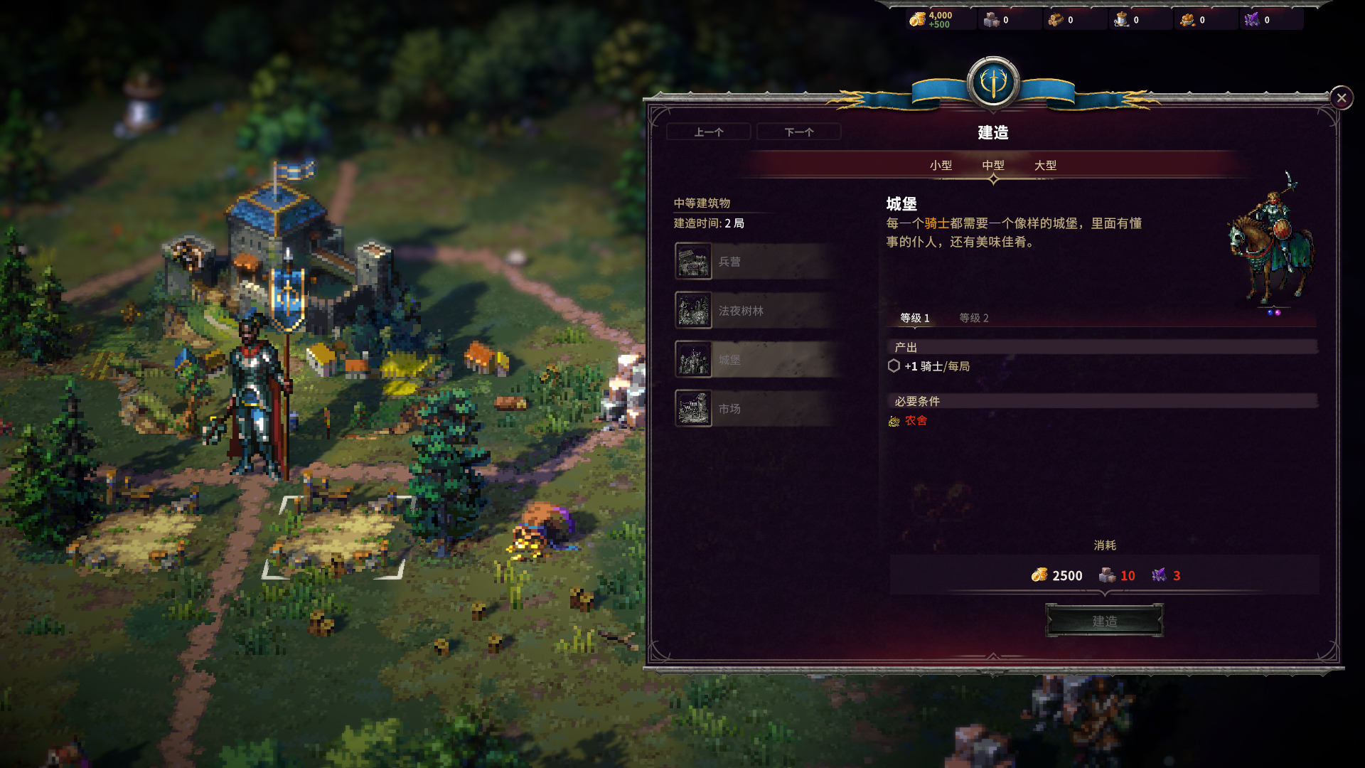 征服之歌里面有6种基本资源,其中有1种主资源(黄金),2种普通资源(石材、木材),3种稀有资源(月光丝线、古代琥珀、星铁矿石),建建筑需要使用这些资源,这点和英雄无敌一样,越强力的建筑需要的材料和数量都比基础强很多,比如采石伐木只要黄金,而农舍农场就需要木头和石材了,不过奇怪的本作有的最基础小型建筑物和中型建筑物就已经开始需求稀有资源,比如产出骑士的城堡就已经要我最后面的星铁了。