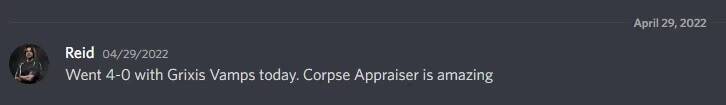 鉴尸客是完美的三费曲线,它既有一个坚实的三费身材,又能进一步帮你找到所需的解牌或者动作,也能为你后续的需要填坟,同时也是一个坟场针对,能够应对像无常神、顽强败犬和歹心隐者这样令人讨厌的生物。同样关键的,鉴尸客和奇奇几奇映影的配合非常强力。这样的组合在面对解牌少的套牌比如纳雅符文时,能够终结比赛。