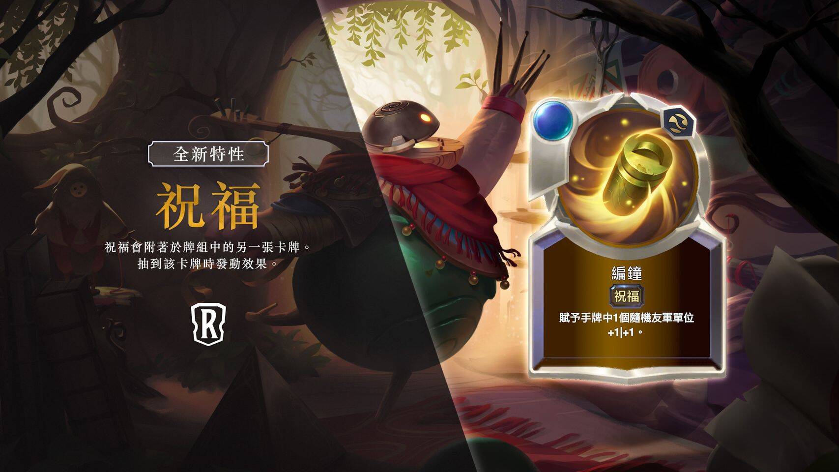 「祝福」是附在我方牌组随机卡牌上的增益效果,抽到时就会发动。第一个祝福能力「木灵」每发动一次便会随机给手牌中的1张单位牌+1|+1。