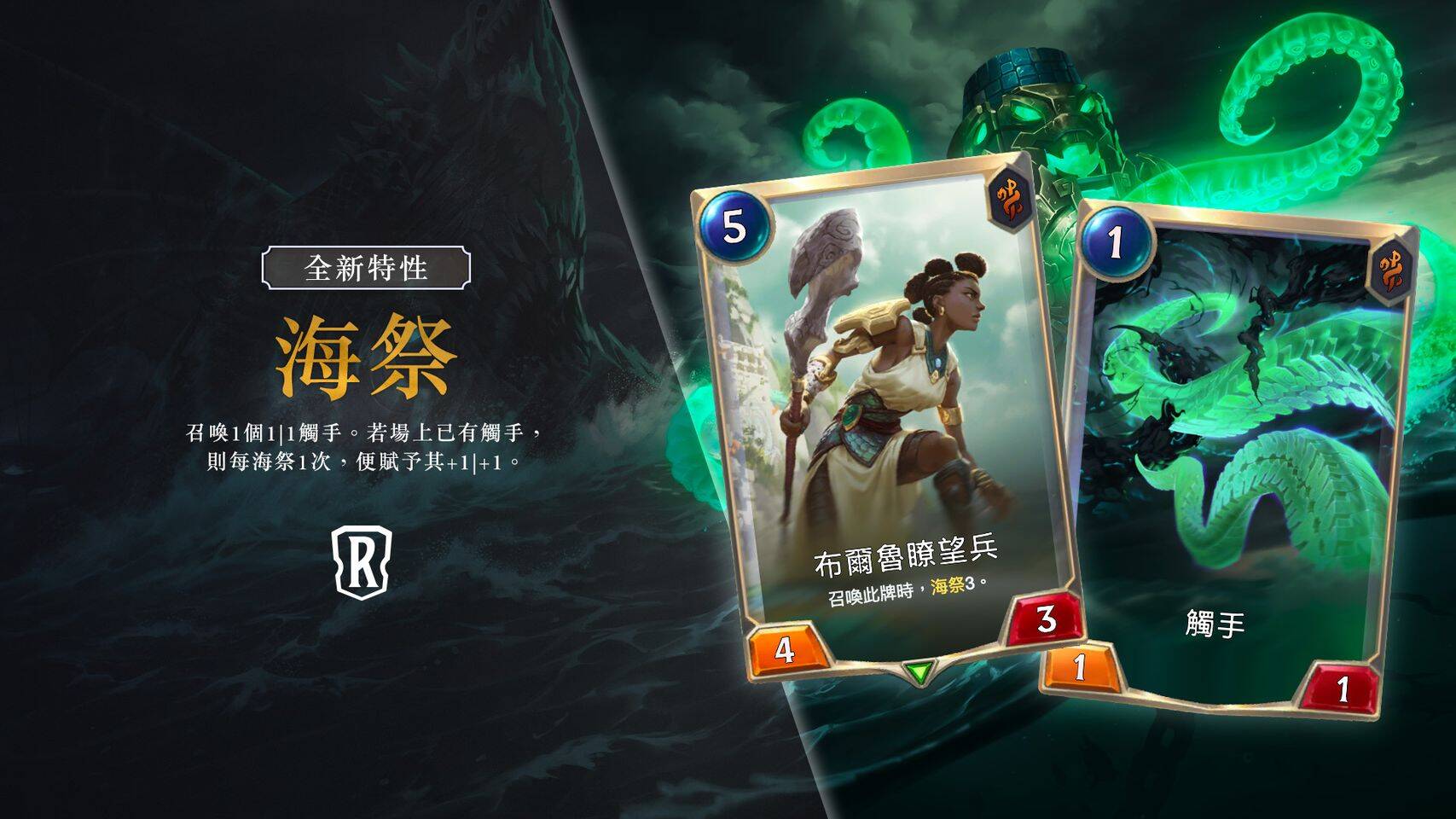 「海祭」可以让你发挥海洋的无边神力,若场上没有触手的话便会召唤一个1|1触手,然后它会随着法术和技能上的海祭次数成长。若你的场上已经有了触手,每次海祭就会给其+1|+1。在牌组放入大量拥有海祭效果的卡牌,用巨大触手辗压你的对手吧!