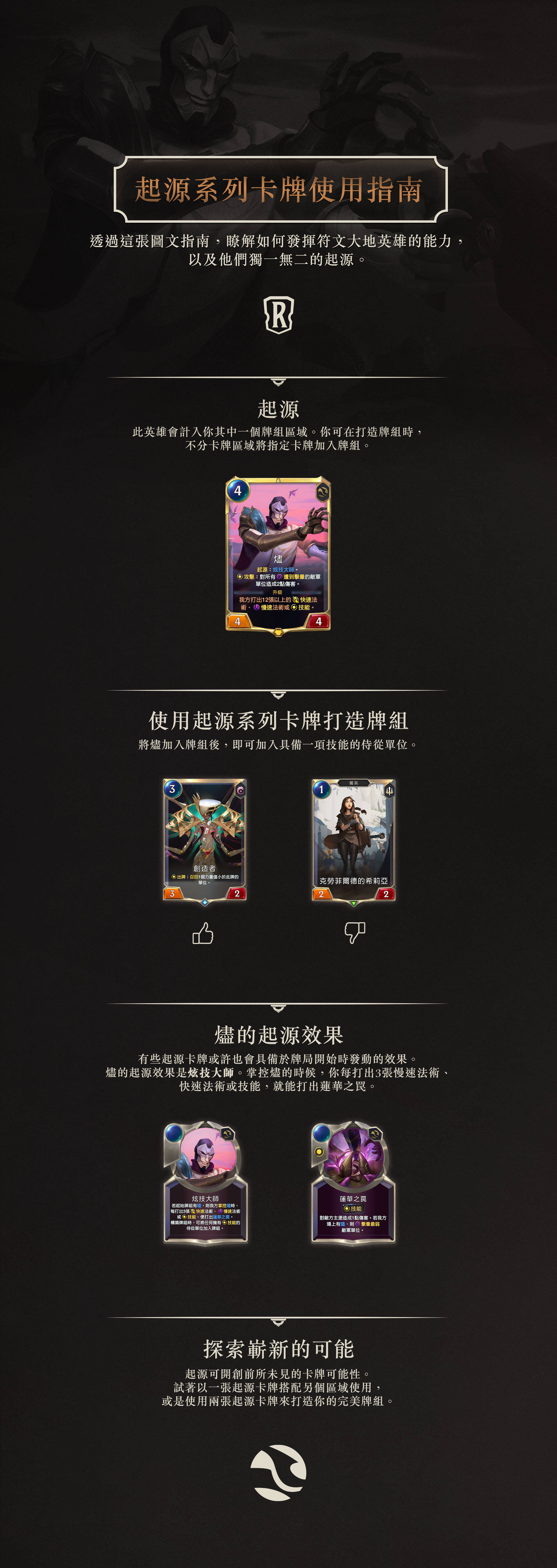 符文之地英雄将在「世界行者」登场,将符文之地英雄放进牌组即视为一个地区,而符文之地英雄有称为「起源」的专属牌组构筑规则,说明可以搭配使用的卡牌。