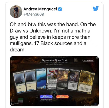 这个起手是否调度是充满争议的,我询问过很多人,回答也是充满分歧。我的本能让我想要保留,因为它只是缺少了我们有17张的黑色法术力源就能成为一个完美的起手。然而在更多地调查统计后,一个四张地且需要抓另一张地才能玩的起手,大概率不如一个六张的起手。我认为接一个需要一个颜色会变得优秀的起手是可以接的,但这个起手并不属于这种情况。