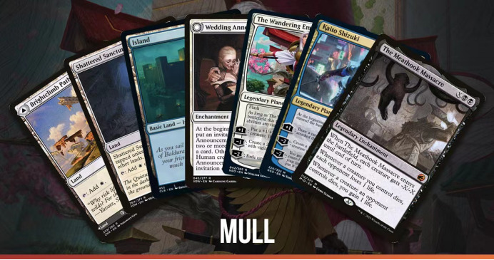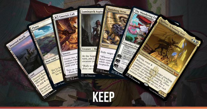 这是一个对阵纳雅符文的后手局。除了没有黑色法术力源,这个起手有所有你希望面对纳雅符文时想要的牌:辉侯求索客加卜策魔拉斐茵的强力曲线以及复数张放逐解。我可以接受因为没有及时来第四块地或者一直没有抓到黑色法术力源而输掉游戏,所以我选择了保留这个起手。
