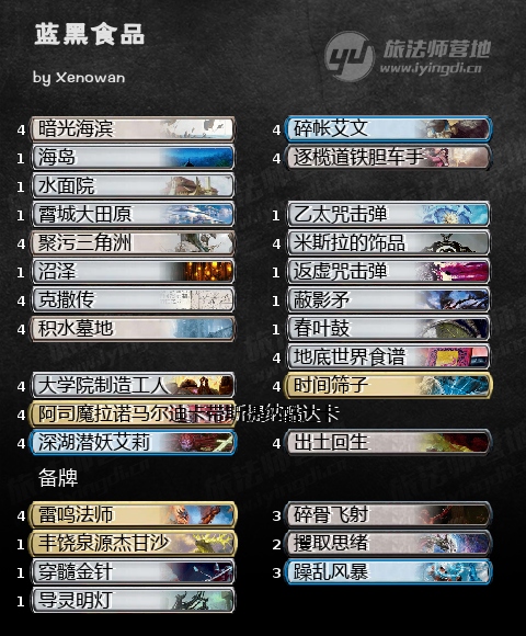 这套牌就是上文所说一个相对比较新的套牌,这套牌其实在没写的那周就有出现过,但是当时的成绩并没有很理想,就没有专门拿出来说。本周这套牌在两天的挑战赛中分别获得了第9和第7的好成绩,也说明了这个套路的合理性。恰好我周内跟朋友练习的时候,他就用了这套牌,也让我对这套牌有了更深的认识。基本玩法是,当你拥有2个食谱、1个大学院制造工人和1个时间筛子时,你就可以用逐榄道铁胆车手制造6个神器衍生物,从而达成无限回合。作为一套鸟牌,主计划无法达成,也完全可以通过阿司魔和碎帐艾文这两个生物车掉对手。但是,这套牌整体是一个比较慢的组合技,不仅仅需要2回合、3回合连续出时间筛子和大学院工人,而且套牌本身对于自己的核心组件也没有很好的保护能力,因此操作起来还是有一定难度的。当然,胜在套牌整体来说除了克撒传和碎帐艾文就比较便宜了,有实力的小伙伴可以尝试组组看。