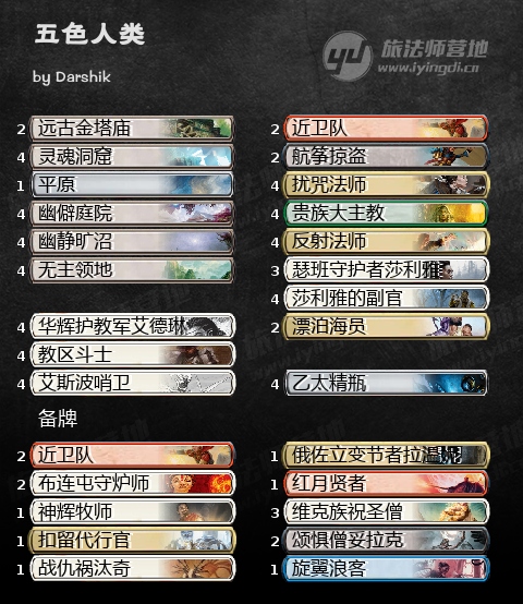 “很久没见五色人类了”,每当我有这种想法的时候,这种套牌就会跳入我的眼帘,告诉我自己永远存在。在NEO的新五色地出来后,五色人类就调整为14张五色地+1**本地+4**冠地的版本,也算是个小加强吧。其他生物方面,也基本放弃了传统的飞螳骑兵的快速打点思路,转而用华辉护教军艾德琳这张更加中速的单卡作为3费进攻曲线,不得不说,这张警戒生物各方面都很契合五色人类,不仅自身攻防足够高,同时还能持续造人触发副官和教区斗士的身材增幅异能。